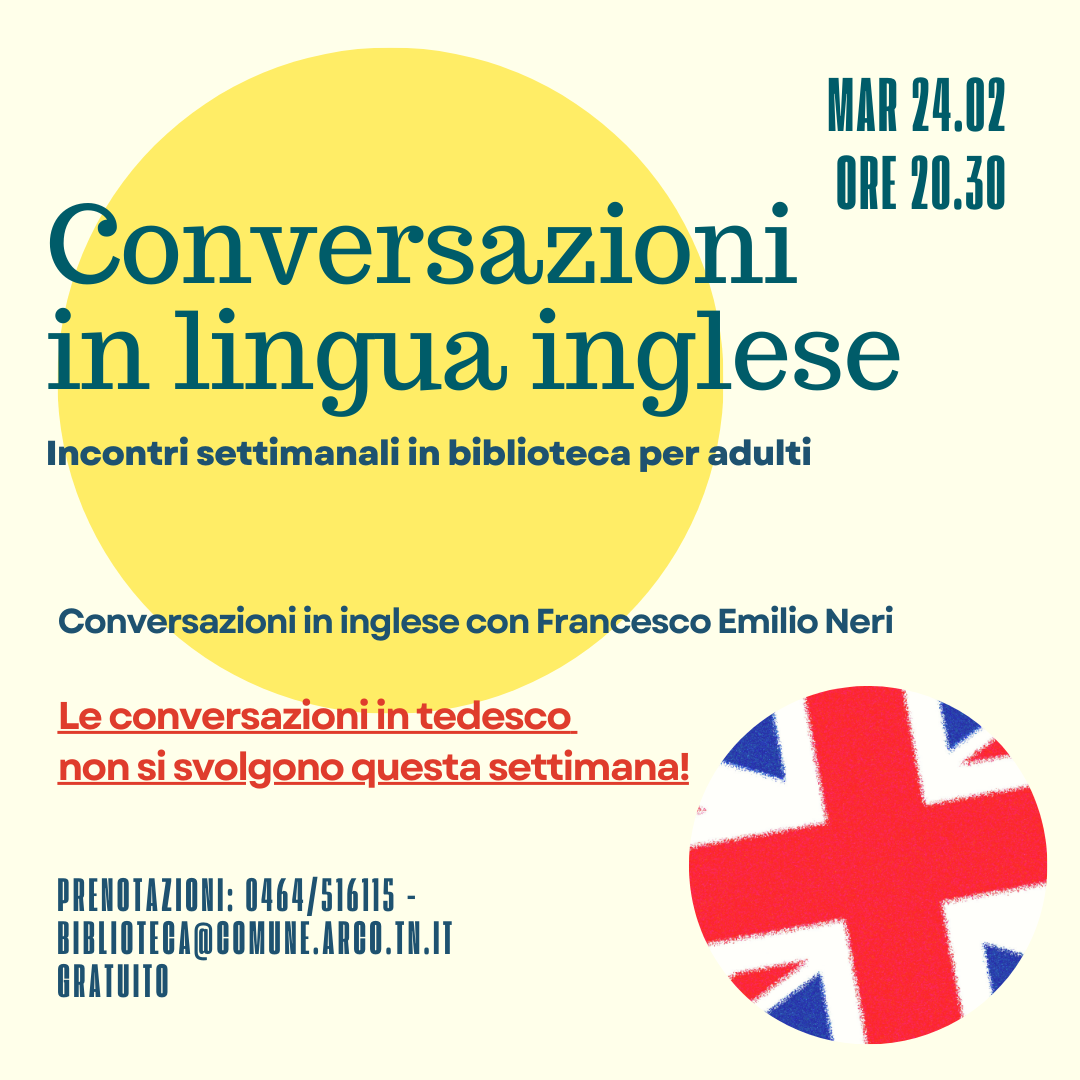 Le conversazioni in tedesco, tenute da Franco Luigi Lohs nella sala Saggistica con inizio alle ore 20, riprendono regolarmente la settimana prossima, martedì 3 febbraio. Come di consueto, lo stesso giorno nella sala delle Arti con inizio alle 20.30 Francesco Emilio Neri conduce le conversazioni in inglese. Per entrambe le proposte la partecipazione è gratuita con prenotazione consigliata (0464 516115 oppure biblioteca@comune.arco.tn.it).