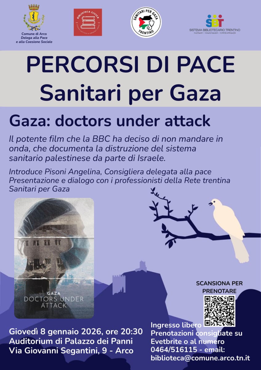 La proiezione inizia alle 20.30, la serata è introdotta dalla consigliera con delega alla pace Angelina Pisoni in dialogo con i professionisti della rete trentina Sanitari per Gaza.