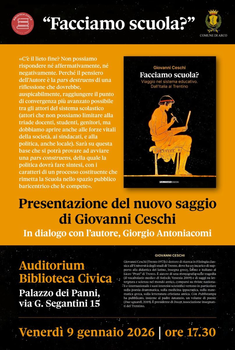 Giovanni Ceschi (Trento 1973) è dottore di ricerca in Filologia classica all’Università degli studi di Trento, dove ha un incarico di supporto alla didattica del latino. Insegna greco, latino e italiano al liceo «Prati» di Trento. È autore di una monografia sulla tragedia, «Il vocabolario medico di Sofocle» (Venezia, 2009) e di saggi su letteratura e scienza nel mondo antico, comparsi su riviste nazionali e internazionali. I suoi interessi scientifici vertono in particolare sulla poesia drammatica, sulla medicina ippocratica, sulla matematica greca, sulla letteratura cristiana antica. Con Publistampa nel 2019 ha pubblicato, insieme al padre Amanzio, il volume di poesie «Due sguardi». È presidente di Docet, associazione degli insegnanti del Trentino.