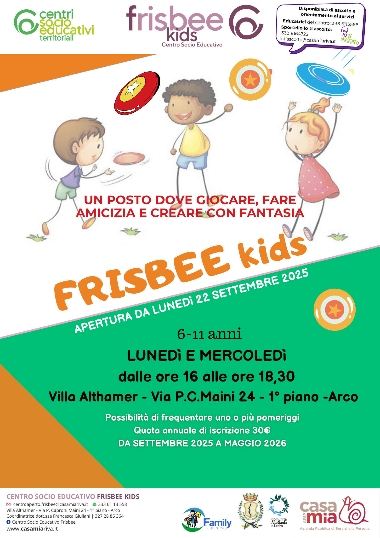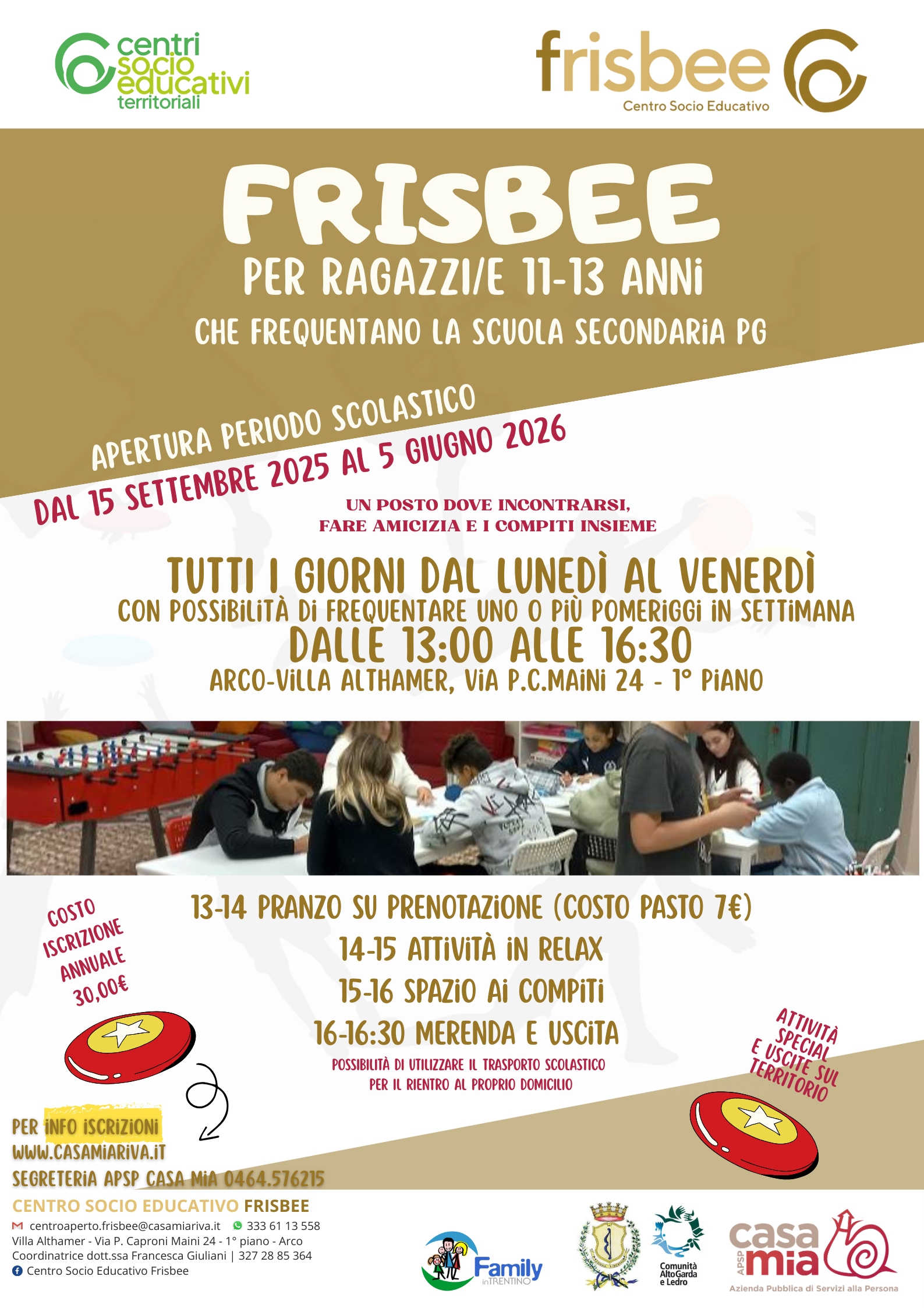 Il costo annuale, calmierato, è di solo 30 euro, grazie al contributo della Comunità Alto Garda e Ledro e del comune di Arco, che credono nell’importanza di spazi educativi di qualità per i più giovani e nella necessità di sostenere, in questo tempo di denatalità, le famiglie. Oltre alla frequenza quotidiana vengono proposte uscite sul territorio, momenti di svago di gruppo, attività di cittadinanza attiva e impegno civico. Nella versione Frisbee Kids è anche un punto di riferimento per bambine e bambini della scuola primaria, con due pomeriggi settimanali dedicati a loro (lunedì e mercoledì dalle 16 alle 18.30), occasione di socializzazione e crescita in un contesto diverso da quello scolastico o sportivo, in cui rinforzare o sperimentare nuove abilità e competenze.
