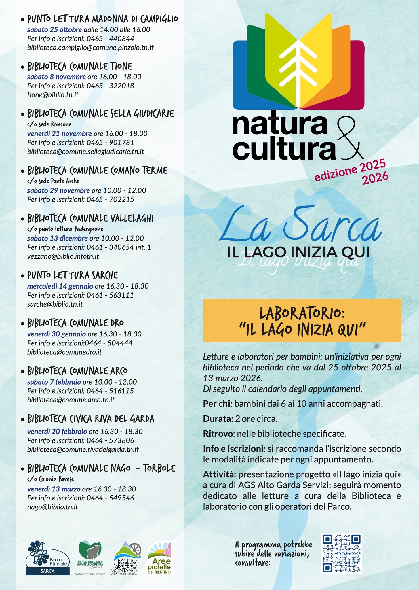 Gli incontri iniziano con la presentazione del progetto «Il lago inizia qui» a cura di Ags, Alto Garda Servizi; a seguire un momento dedicato alle letture a cura della biblioteca e un laboratorio con gli operatori del parco fluviale.