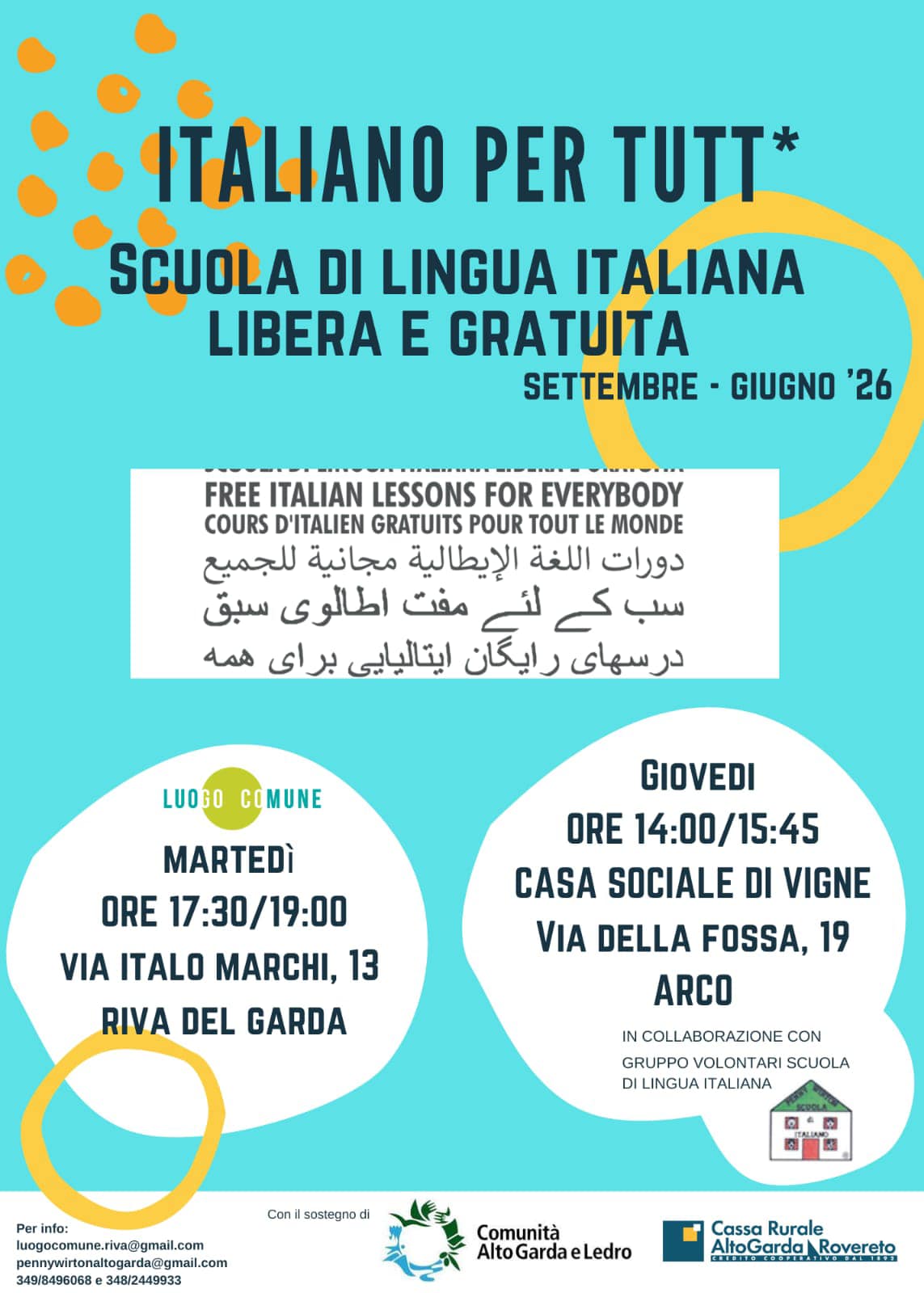 È il corso di italiano per tutte e tutti organizzato da Luogo Comune e dal gruppo di volontari della scuola di lingua italiana Penny Wirton Alto Garda, gratuito e senza necessità di prenotazione, che si tiene da settembre a giugno 2026 ad Arco alla Casa sociale di Vigne (in via della Fossa 19) tutti i giovedì dalle 14 alle 15.45, e a Riva del Garda nella sede di Luogo Comune (in via Italo Marchi 13) tutti i martedì dalle 17.30 alle 19.