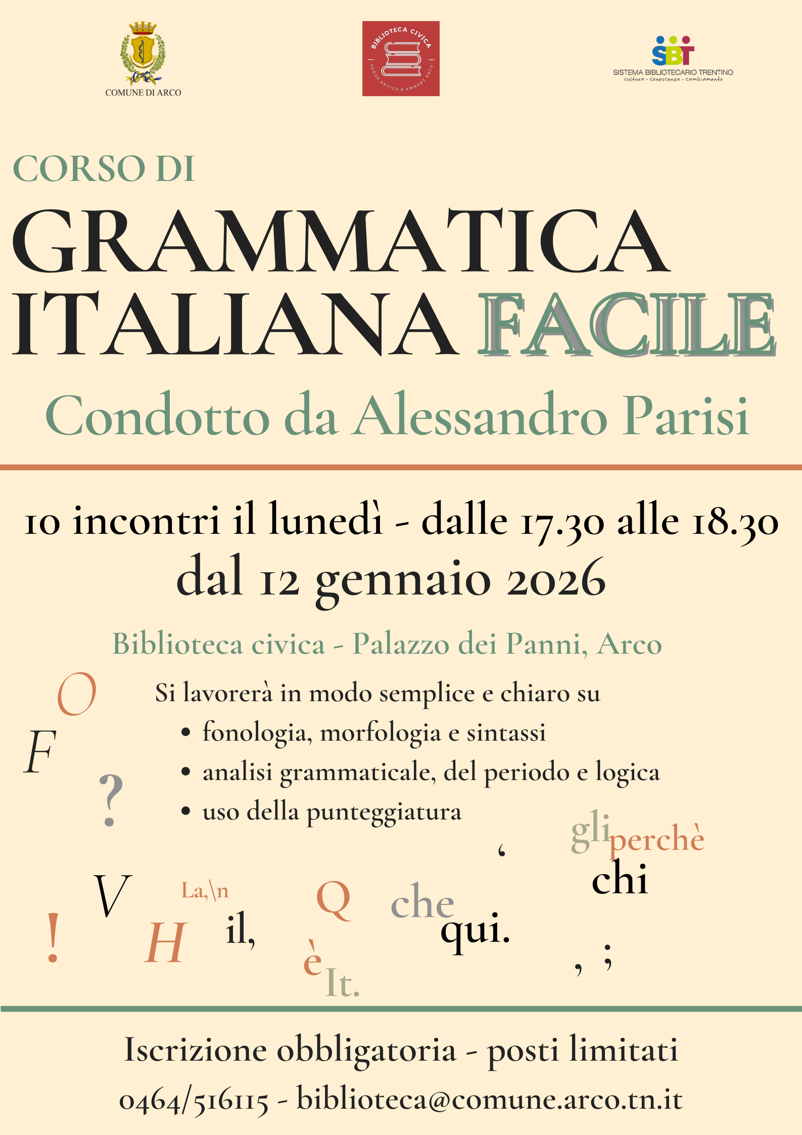 Il corso è gratuito con iscrizione obbligatoria: per telefono al numero 0464 516115 o per email all'indirizzo biblioteca@comune.arco.tn.it.