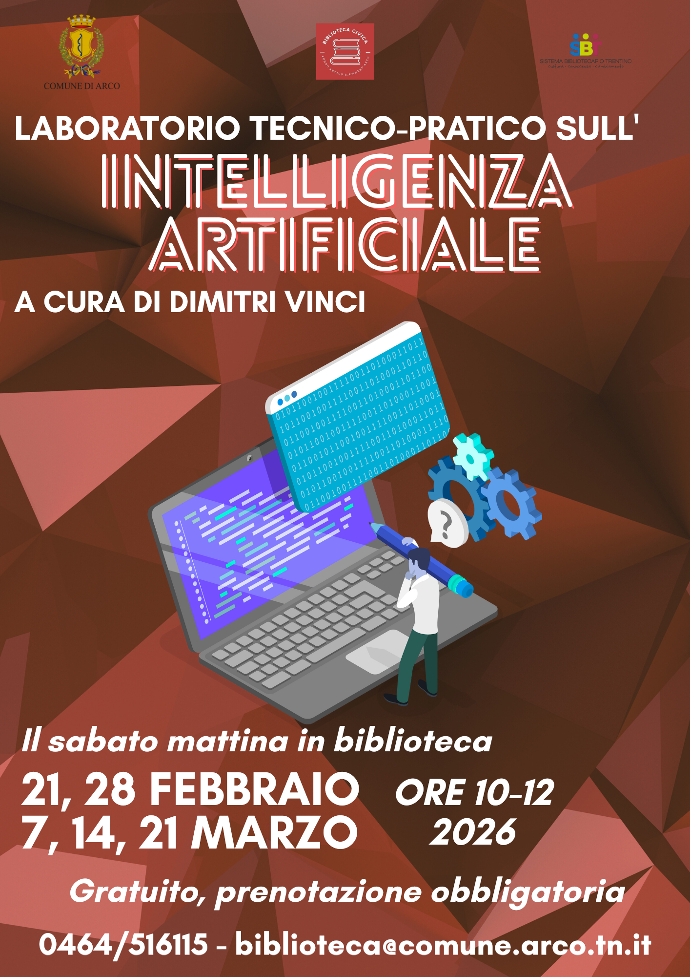 Il sabato mattina dalle 10 alle 12 dal 21 febbraio al 21 marzo, cinque incontri condotti da Dimitri Vinci, gratuiti ma con posti limitati e prenotazione obbligatoria (0464 516115 o biblioteca@comune.arco.tn.it). Ai partecipanti è richiesto di avere con sé un laptop personale.