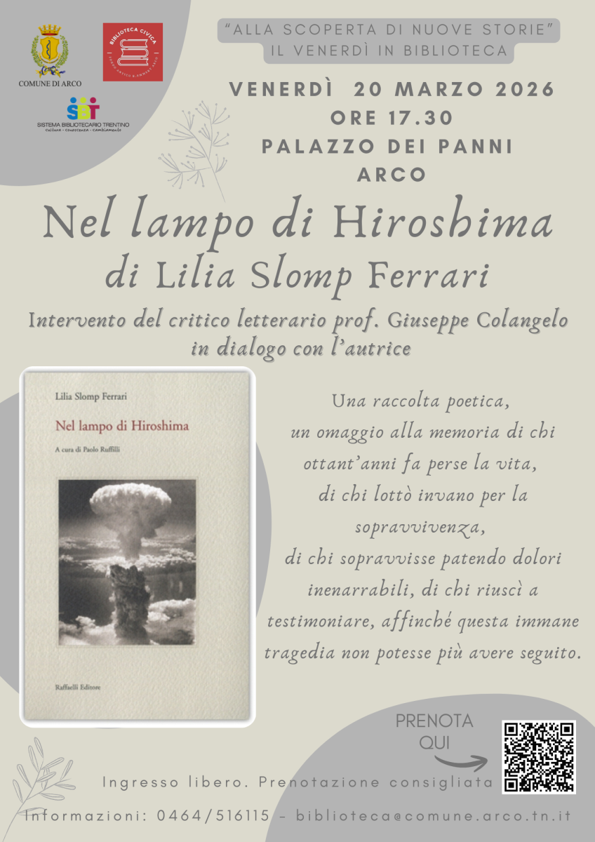 La prenotazione (consigliata) si può fare su Eventbrite (clicca qui) oppure contattando la biblioteca (0464 516115 o biblioteca@comune.arco.tn.it).
