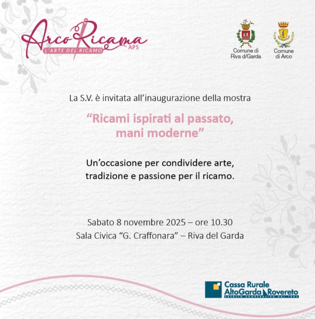 La mostra prende avvio dal progetto “Ricami di memoria”, allestito al Mets nel 2024, ispirato ai decori della chiesa di San Michele e agli ambienti museali. In quell’occasione, le ricamatrici di Arco Ricama hanno riportato alla luce il “punto Valsugana”, testimonianza preziosa di un sapere antico. Oltre a queste creazioni, il pubblico potrà ammirare lavori nati dalla precedente esposizione “Fregi, grottesche e decori nei monumenti dell’Alto Garda”, realizzata nel 2019 a Casa Collini in collaborazione con il Comune di Arco. In quella rassegna le socie di Arco Ricama reinterpretarono i motivi ornamentali delle chiese e dei palazzi del territorio, trasformando pietra e affreschi in ricamo e filigrana di filo.