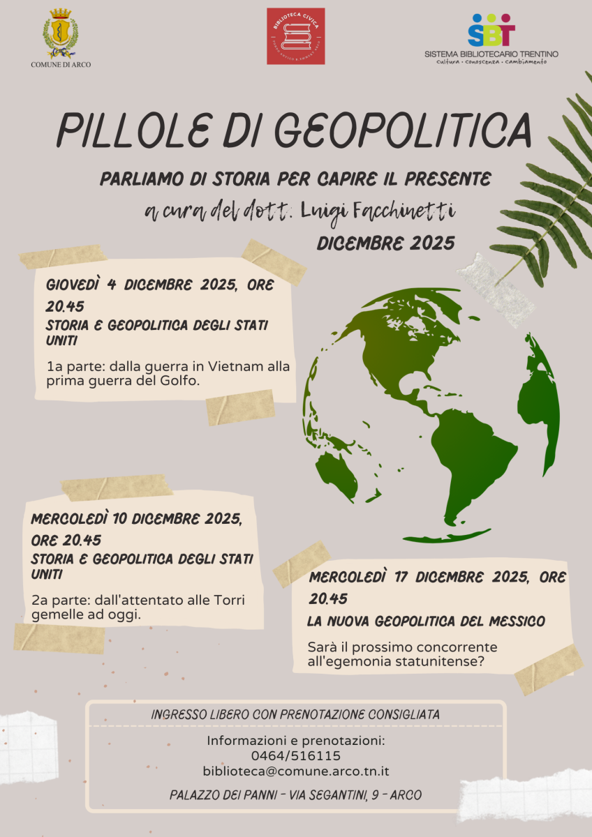 Gli incontri, in biblioteca, vogliono essere un modo per fare chiarezza sulle vicende politiche che interessano il presente, attraverso una lettura geopolitica della storia contemporanea. Il conduttore, il dott. Luigi Facchinetti, proporrà un dialogo tra i presenti, illustrando in modo semplice e chiaro i temi, diversi in ogni serata. L’inizio è sempre alle ore 20.45; la partecipazione è gratuita, tuttavia per motivi organizzativi è richiesta la prenotazione (0464 516115 o biblioteca@comune.arco.tn.it).